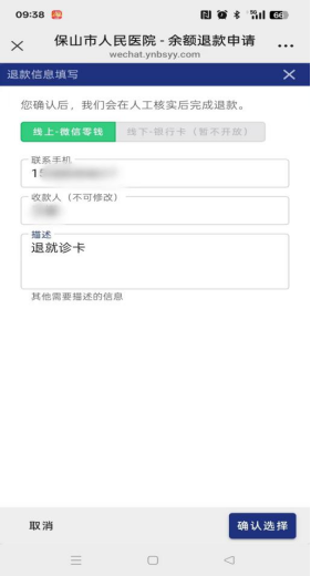 5.在查询结果中选择本人对应的信息,填写退款信息(电话需准确填写,描述栏注明“退就诊卡”),本人确认选择。