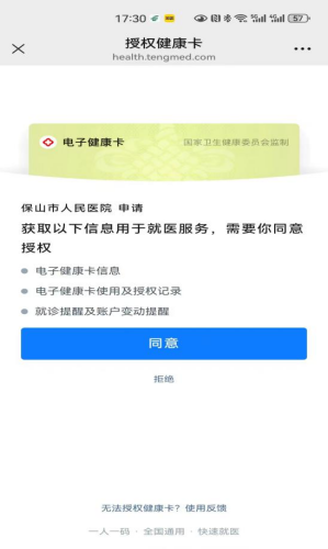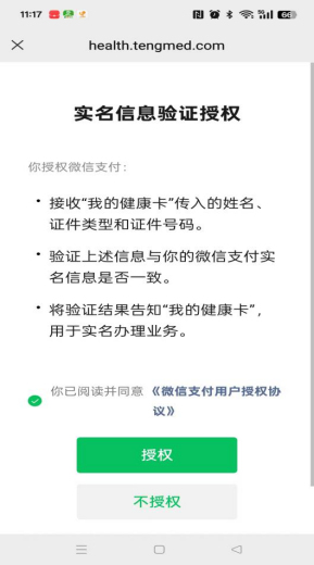 3.在“授权健康卡”环节点击“同意”,验证健康卡时选择“实名认证”(若为他人代办,需选择“家人代验证”);