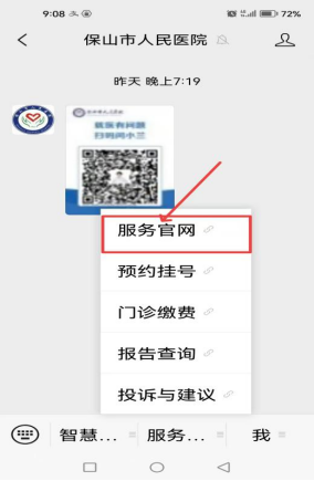 打开微信,搜索“保山市人民医院(服务号)”并关注,进入后选择“服务官网”;